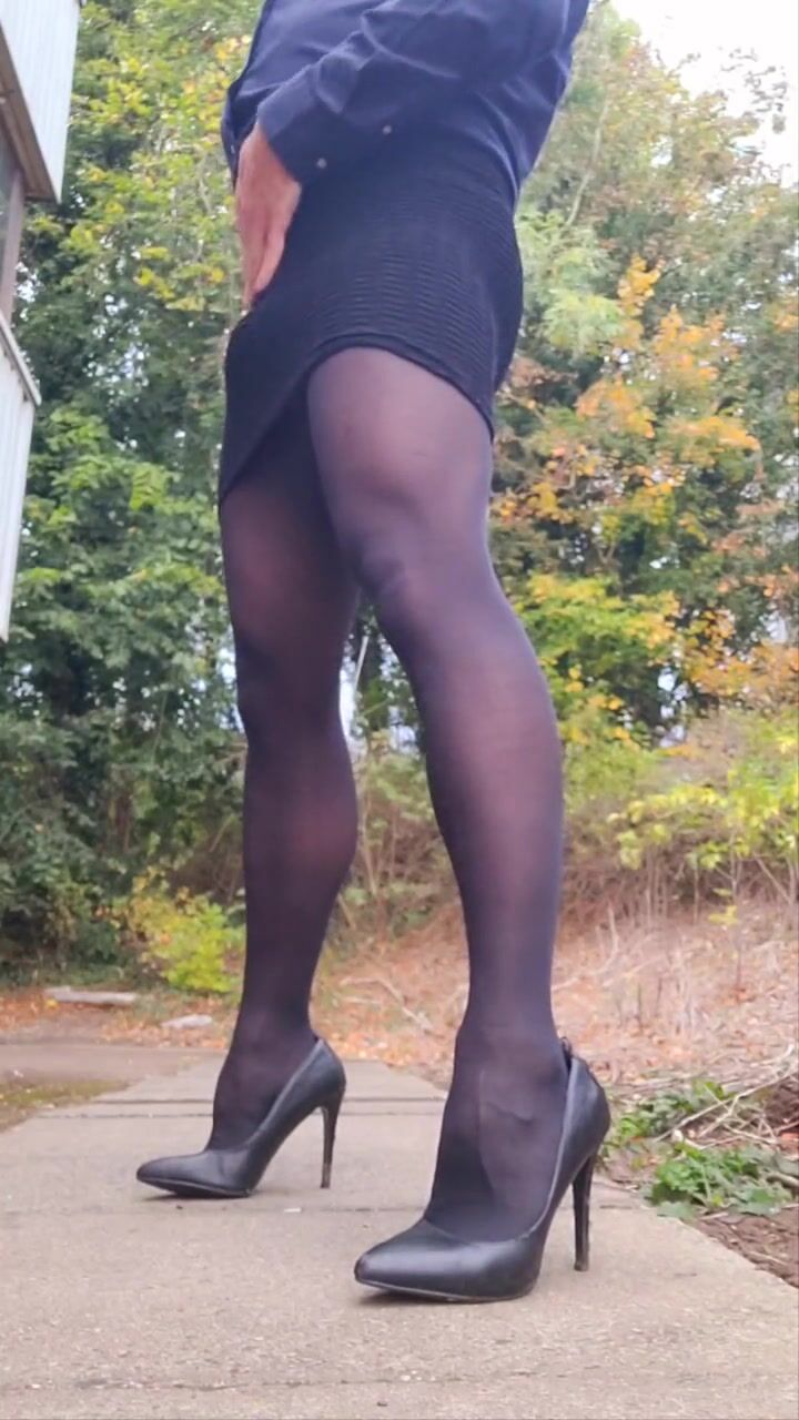 . Crossdresser shows off cock in opaque tights and mini skirt then takes off high heels and cums in one then puts it back on. Public risky outdoor CD masturbation.