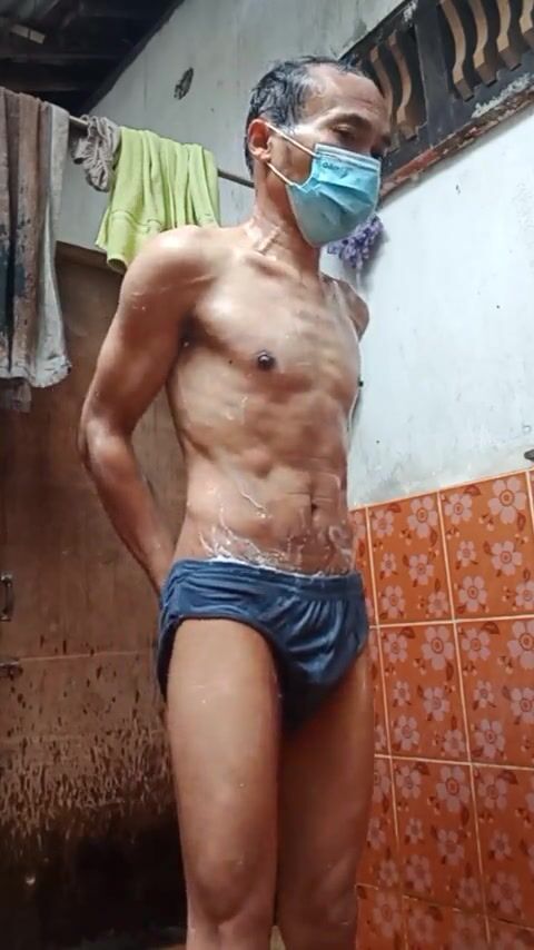 . asian boy bathing naked in bathroom with cold water. her body is petite and sexy, her skin is brown and smooth. His dick is small and cute hiding behind his underwear. he scrubbed his body with soap and washed his hair with shampoo